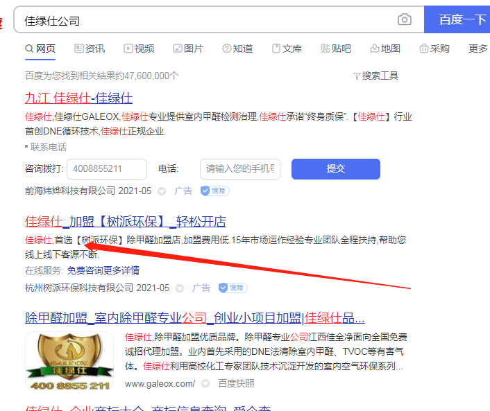 杭州樹派環??萍加邢薰纠梦宜旧虡?佳綠仕"進行百度搜索關鍵詞宣傳,嚴重影響我司合法權益。